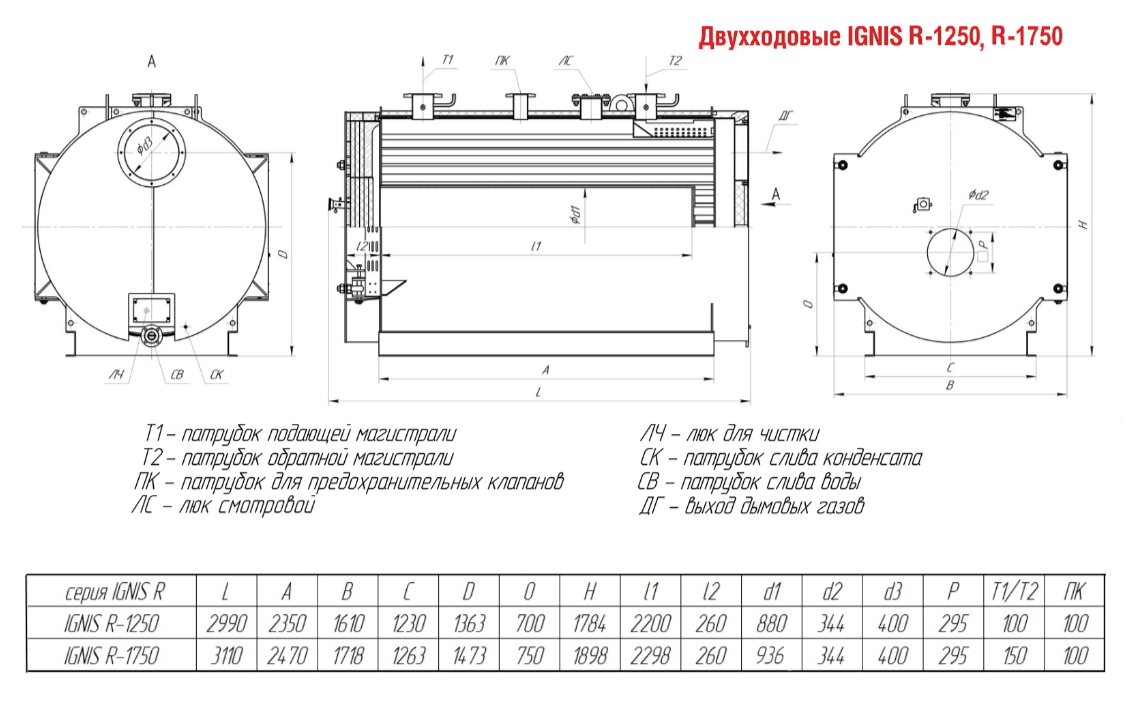 Технические характеристики водогрейного двухходового котла ARCUS IGNIS R-1250