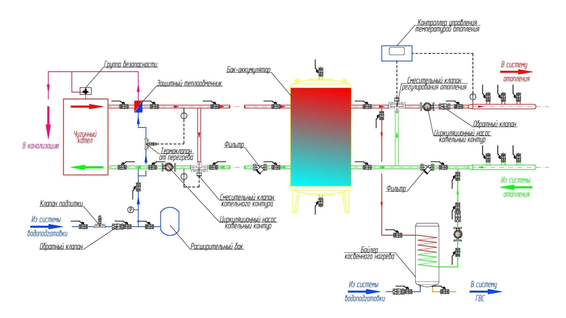 Схема подключения твердотопливного чугунного котла с баком-аккумулятором - буферной емкостью